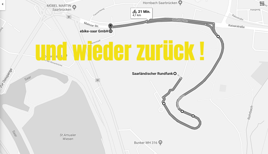 Sie können unser komplettes Angebot kostenlos testen- Auf unserer Teststrecke über ca. 4 km und 70 Höhenmeter, denn nur am Berg zeigt ein Pedelec, was es wirklich kann ! Laut google braucht man normalerweise 21 min. Unsere Kunden schaffen das dank Motorunterstützung etwa in 10 Minuten.